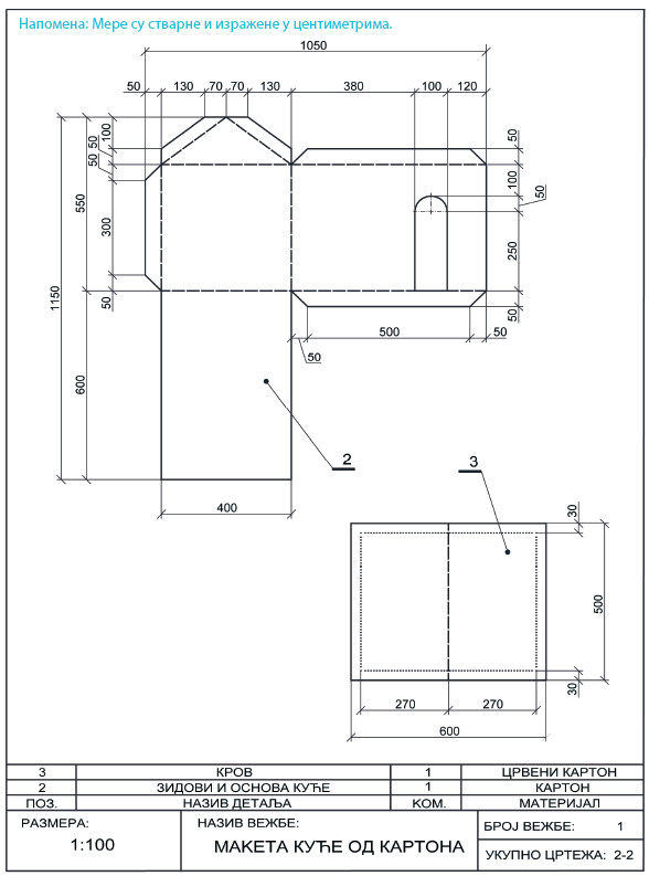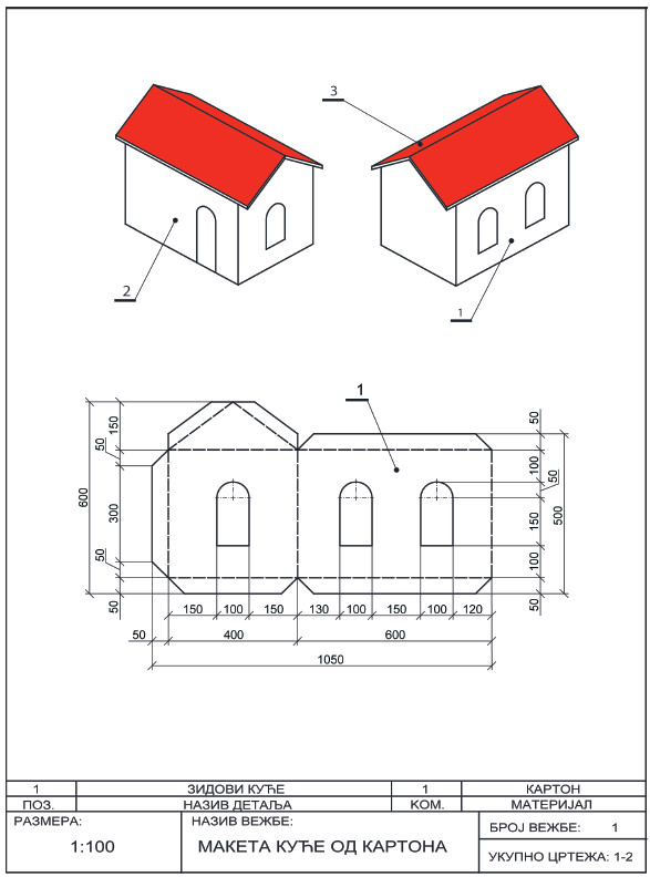 Nacrtaj tehnicki crtez. Maketa letnjikovca, strana 12. u uputstvu za koriscenje - materijal za radne vezbe.